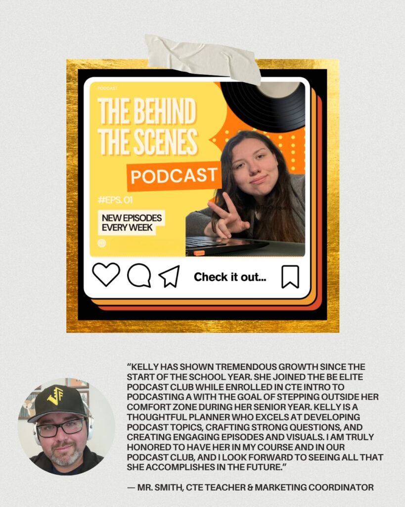 As a dedicated member of the Be Elite Podcast Club and a student in our CTE Intro to Podcasting A course within the Marketing Pathway, Kelly has spent the year bringing her creativity and ideas to life. She developed her own podcast series concept, turned her vision into engaging visuals using Canva, and earned two Canva certifications along the way.