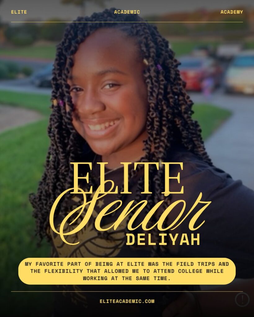 Meet Deliyah, a graduating senior from our Virtual Academy who has truly made the most of her time at Elite. One of her favorite parts of being an Elite student was the opportunity to participate in field trips while also having the flexibility to attend college and work at the same time. That balance allowed her to grow both academically and personally as she prepared for life beyond high school.