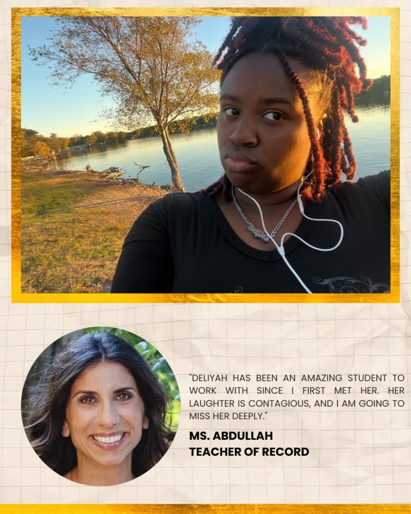 Outside of academics, Deliyah enjoys playing Marvel Rivals, baking, and swimming, interests that highlight her creativity and love for balance. As her teacher of record shared, Deliyah has been an absolute joy to work with. Her laughter is contagious, and she will be deeply missed.
