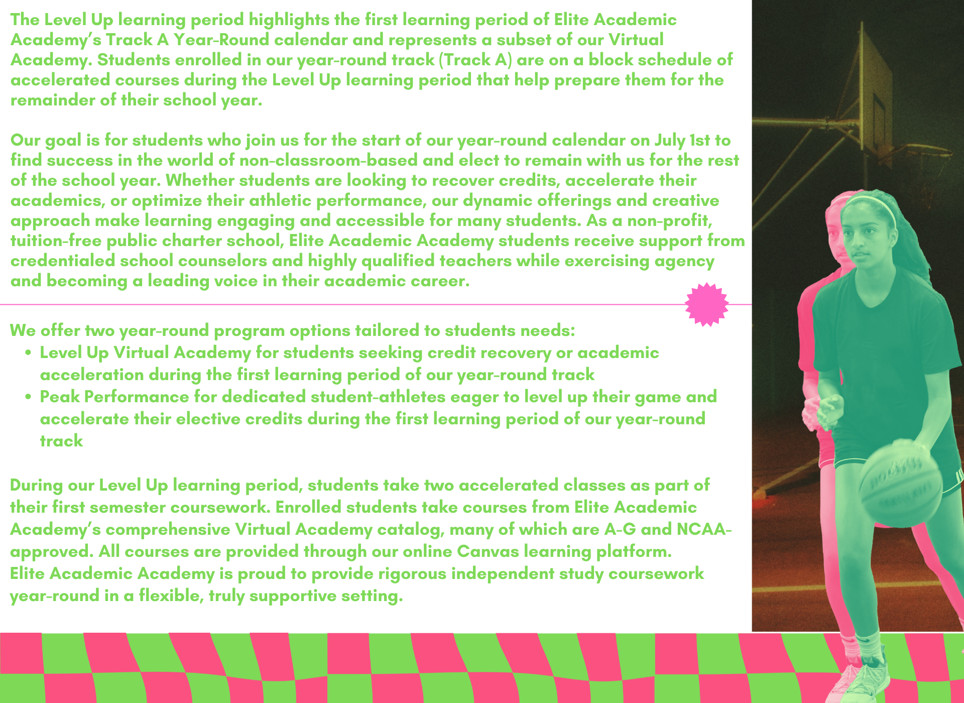Elite Academic Academy is a year-round school. The Level Up learning period marks the beginning of our year-round school year, and students can remain with us for the remainder of the school year.